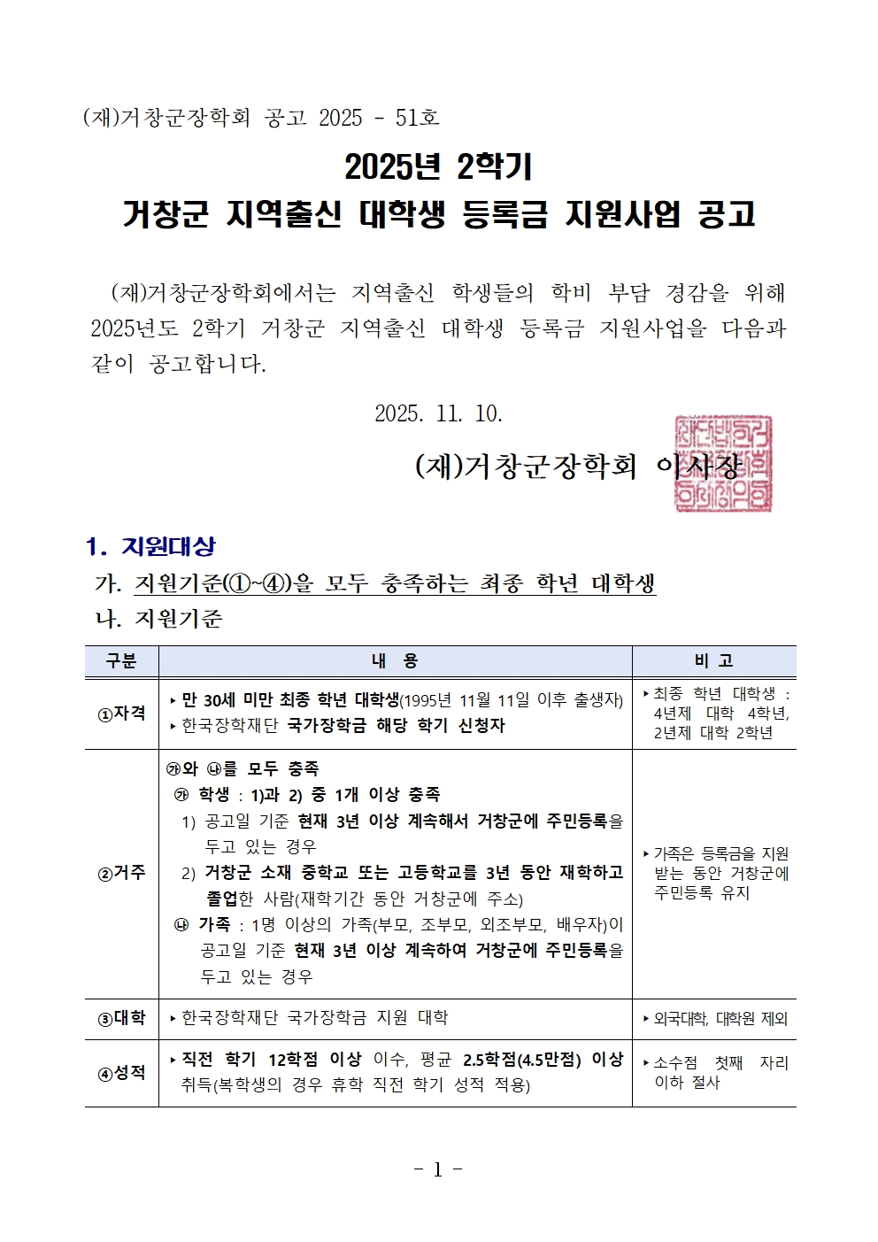2025년 2학기 거창군 지역출신 대학생 등록금 지원사업 공고 페이지 정보 작성자 거창군장학회 조회 142 회 25-11-10 09:49 공고문2025년 2학기 거창군 지역출신 대학생 등록금 지원사업 공고.pdf (326.6K) 거창지역출신_대학생_등록금_신청서서식.hwp (48.5K) 본문 2025년 2학기 거창군 지역출신 대학생 등록금 지원사업 공고 목 록 다음글거창지역출신 대학생(최종학년) 등록금 신청 연장 접수(2차) 25.06.20